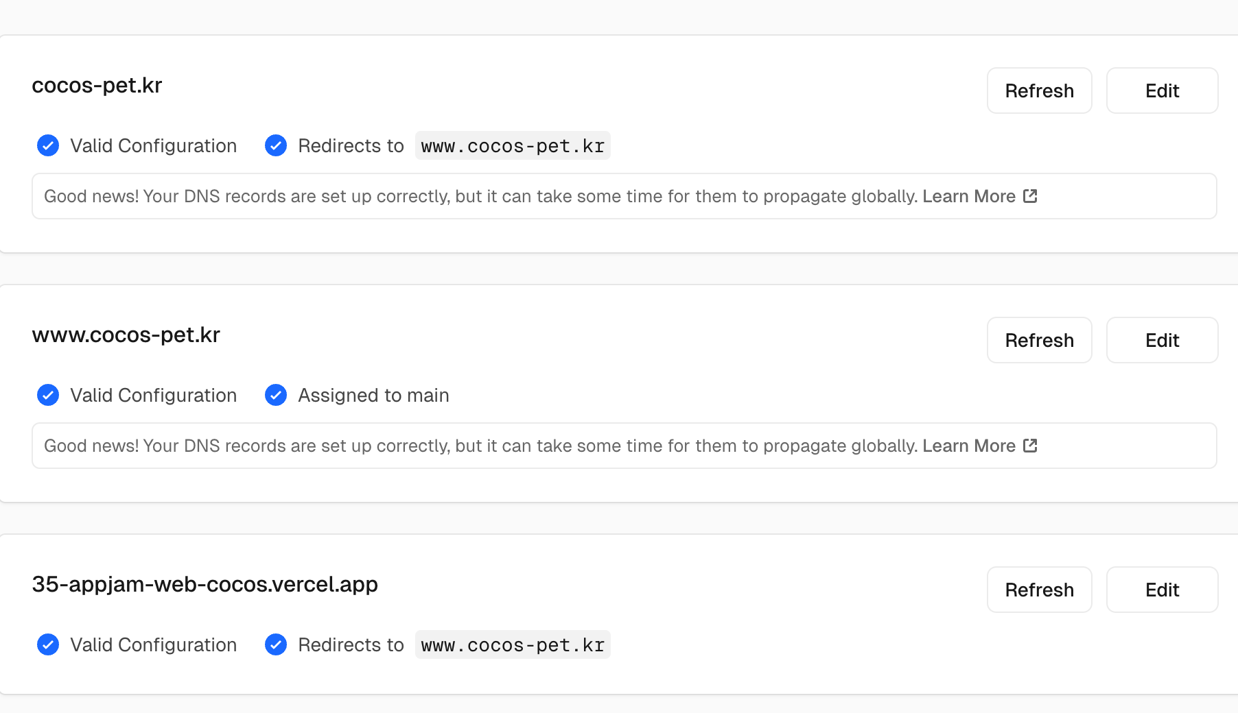 여튼 그렇게 가비아에서 DNS에 잘 등록해두고, 버셀 도메인 refresh를 진행하면 아래와 같이 Valid 로 변하고 연결이 성공합니다!