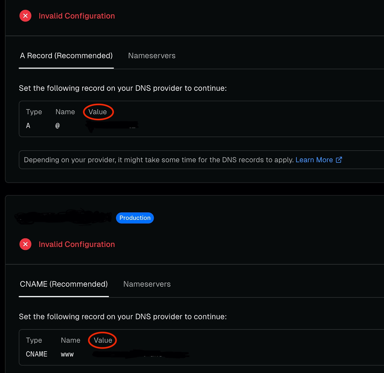 처음에 버셀에 구매한 도메인을 연결하면 뜨는 Invaild Configuration 과 함께 뜨는 A 와 CNAME 값들을 복사해오면 됩니다! (확인하면 됩니다) - 그리고 recommended 를 클릭해서 domain을 연결하면 됩니다.