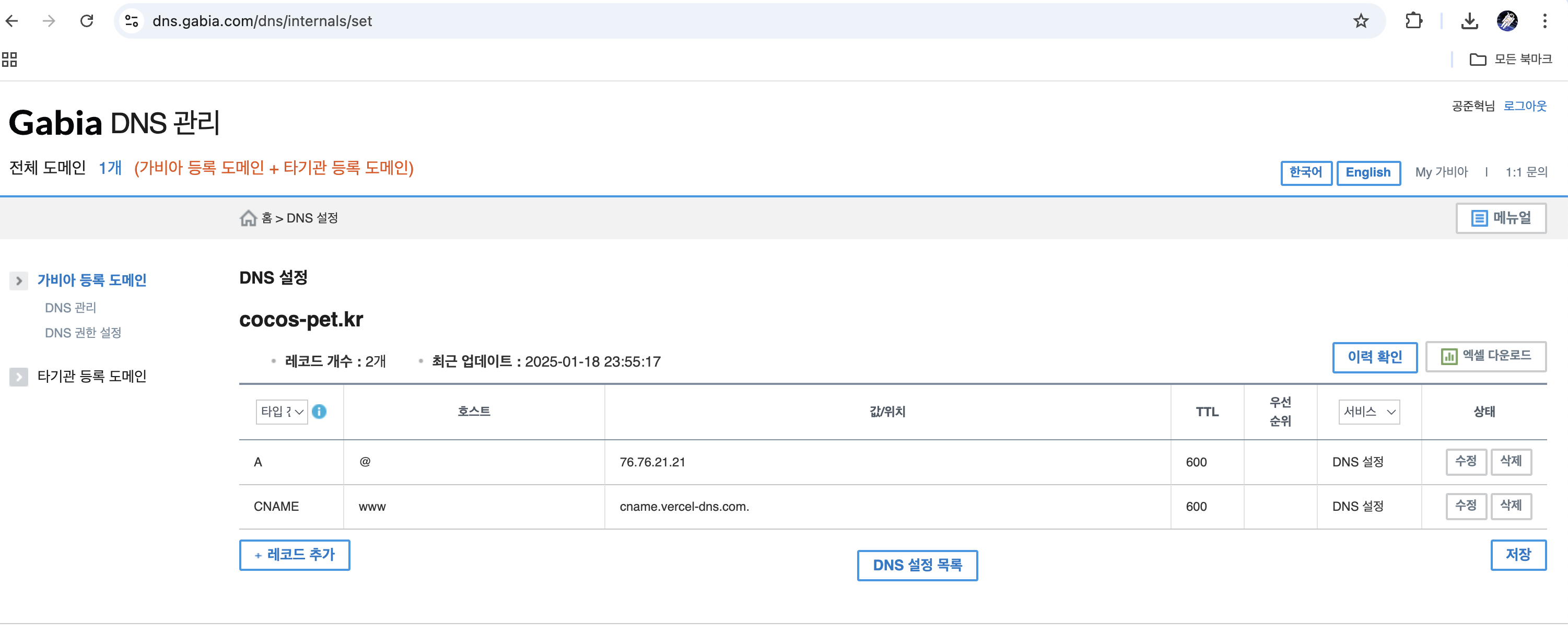 구매한 도메인을 등록해줘야합니다. 가비아 DNS 관리 사이트로 이동해서, 타입에 따른 호스트값, 값, TTL(time to live) 같은 걸 저장해둡니다. 아래와 같이요!