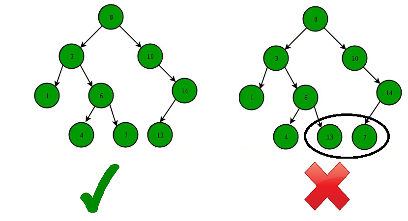 이진트리의 일종으로, 특정 노드(A노드) 의 왼쪽 하위 트리에는 A 노드의 값보다 큰 값이, 오른쪽 하위 트리에는 A 노드의 값보다 작은 값이 들어있는 트리를 의미합니다. BST를 통해 빠른 속도로 값을 찾아낼 수 있습니다. (전체 탐색 X)